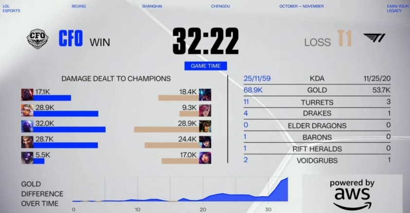 Trước trận, ít ai dám tin đại diện đến từ khu vực LCP lại có thể đứng vững trước một T1 hùng mạnh. Tuy nhiên, CFO đã trình diễn một lối chơi cực kỳ áp đảo với những vị tướng mạnh mẽ ở đầu và giữa trận như Qiyana hay Draven. Qua đó CFO thể hiện khả năng kiểm soát mục tiêu vượt trội, CFO ăn tới 4 Rồng nguyên tố, 1 Baron và 2 Sâu Hư Không, đồng thời phá 11 trụ của đối thủ – trong khi T1 chỉ có được 3.