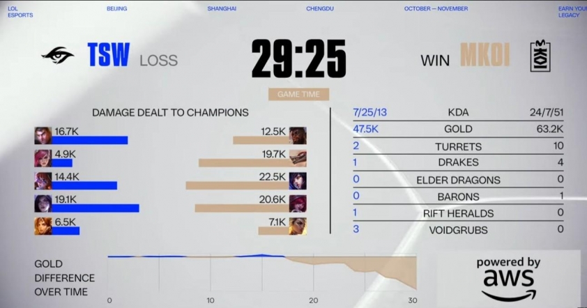 Thống kê chỉ ra MKOI ăn 4 rồng và 1 Baron, trong khi TSW gần như không tranh chấp thành công bất kỳ mục tiêu lớn nào. Ở phút 23, pha giao tranh tại khu vực hang Baron chính là bước ngoặt – MKOI vừa có được bùa lợi vừa hạ gục 4 thành viên TSW, qua đó mở toang toàn bộ bản đồ.