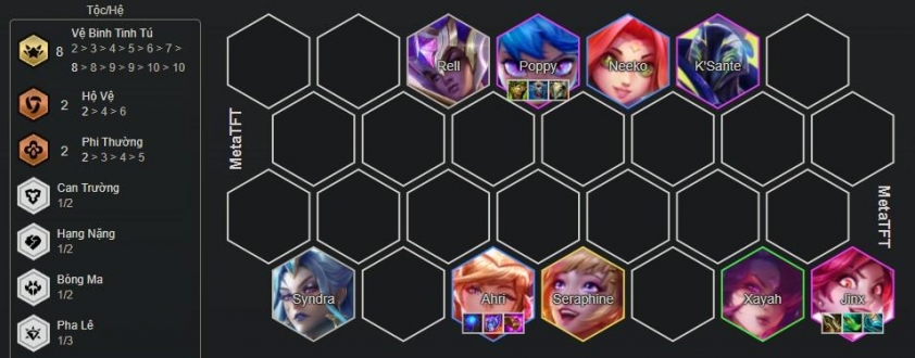 - Sau khi đạt cấp 9, bổ sung các đơn vị 4-5 vàng như Seraphine, Poppy...để hoàn thiện mốc 8 Vệ Binh Tinh Tú