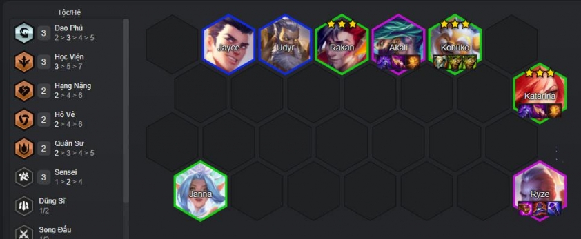 - Sau khi lên cấp 8, bổ sung Janna và Akali để kích hoạt mốc 2 Quân Sư và 3 Đao Phủ