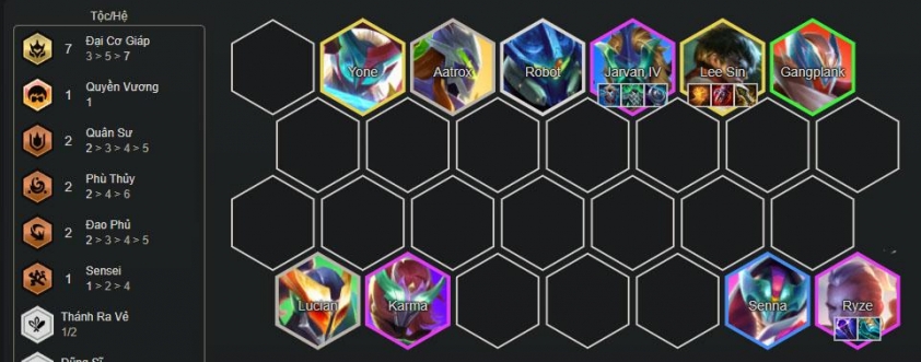 - Sau khi lên cấp 9, bổ sung Lee Sin, Yone và Karma nhằm hoàn thiện đội hình