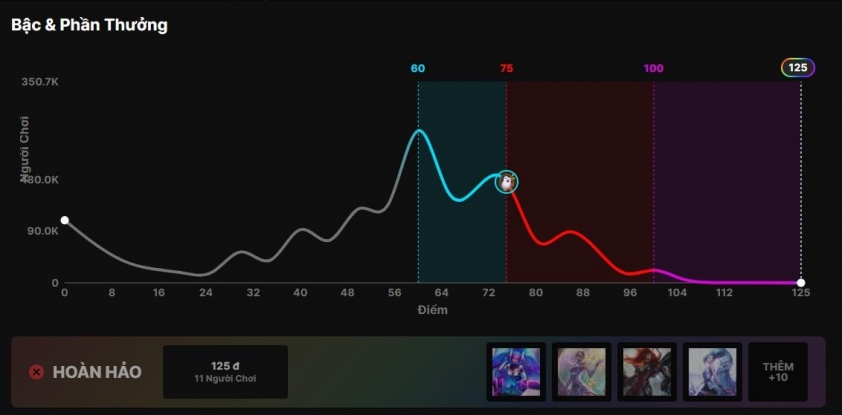 Nhìn vào biểu đồ phân bố điểm, có thể thấy phần lớn người chơi rơi vào khoảng 60 – 75 điểm, tức chỉ đoán đúng khoảng một nửa số trận. Càng về cuối, số người đạt trên 100 điểm giảm mạnh – và gần như chạm đáy ở mốc 125.