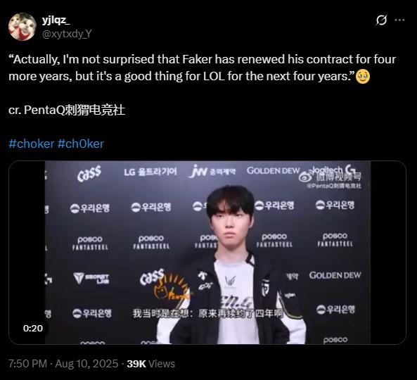 Mới đây, sau trận đấu với KT Rolster, Chovy – ngôi sao đường giữa của Gen.G – đã có những chia sẻ đầu tiên về sự kiện này: “Thực ra, bản thân tôi không hề ngạc nhiên khi Faker gia hạn hợp đồng với T1 thêm 4 năm nữa. Nhưng tôi nghĩ bản hợp đồng đó là một điều tốt đẹp cho LMHT”.