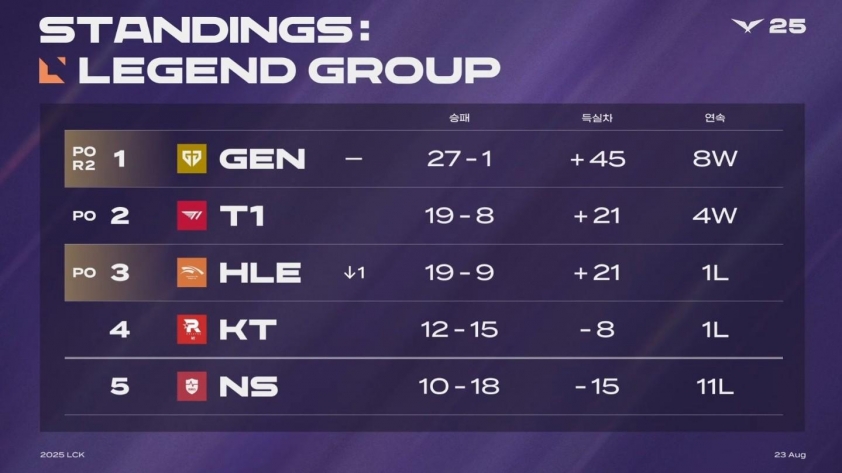 Cách đây ít giờ, Gen.G đã thể hiện một phong độ hủy diệt tại LCK Mùa Hè 2025 khi vừa đánh bại Hanwha Life Esports (HLE) để nối dài mạch thắng. Với chiến thắng này, Gen.G nâng thành tích lên 27-1, cùng hiệu số +45, giữ vững ngôi đầu bảng Legend Group với chuỗi 8 trận thắng liên tiếp. Mặc dù Gen.G đã có vé chơi ở vòng playoffs LCK từ lâu (cùng với đó là tấm vé dự CKTG 2025) nhưng đội tuyển này vẫn cho thấy sự nghiêm túc rất lớn và hướng tới danh hiệu LCK.