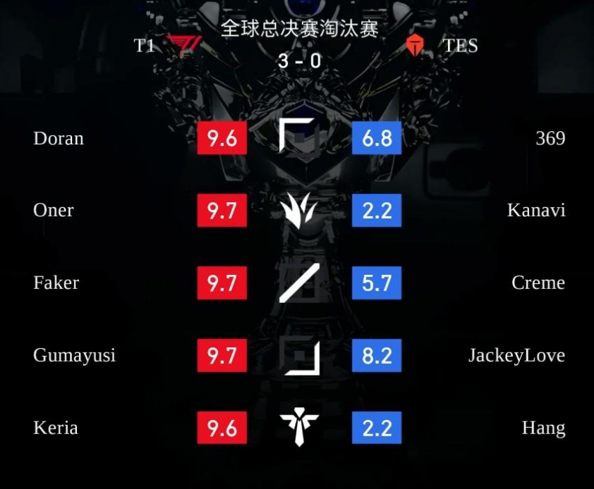 Theo bảng chấm điểm từ cộng đồng Trung Quốc, Oner và Faker là hai cái tên xuất sắc nhất trận khi cùng đạt 9.7 điểm, thể hiện phong độ hủy diệt trong cả ba ván đấu. Oner gần như bóp nghẹt Kanavi trong mọi tình huống tranh chấp tài nguyên, còn Faker tiếp tục chứng minh đẳng cấp của “huyền thoại sống” với khả năng đọc bản đồ và kiểm soát nhịp độ trận đấu hoàn hảo.