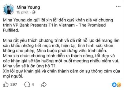 Trước áp lực quá lớn từ dư luận, mới đây Mina Young đã chính thức đăng tải thư xin lỗi, xác nhận rút khỏi vai trò biểu diễn tại sự kiện. Trong bài viết, cô gửi lời xin lỗi tới khán giả và ban tổ chức, cho biết bản thân rất yêu thích chương trình và đã nỗ lực chuẩn bị, nhưng vì tình hình sức khỏe không cho phép nên buộc phải dừng việc trình diễn. Mina cũng khẳng định vẫn luôn ủng hộ T1 và mong khán giả có một buổi fan meeting trọn vẹn, nhiều niềm vui.