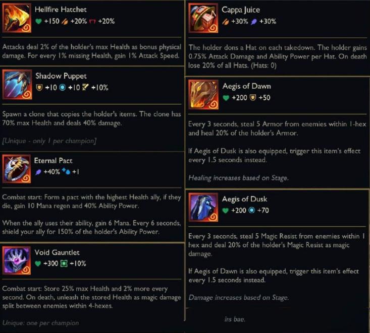 Đây là Tạo Tác khá yếu trong hầu hết đội hình. Chỉ tương đối ổn trên Kai’Sa, vì cô có thể tận dụng cả AD và AP. Với các tướng cận chiến gây sát thương hỗn hợp, việc giữ mũ hiệu ứng rất khó do họ phải lao vào giao tranh và dễ mất stack.