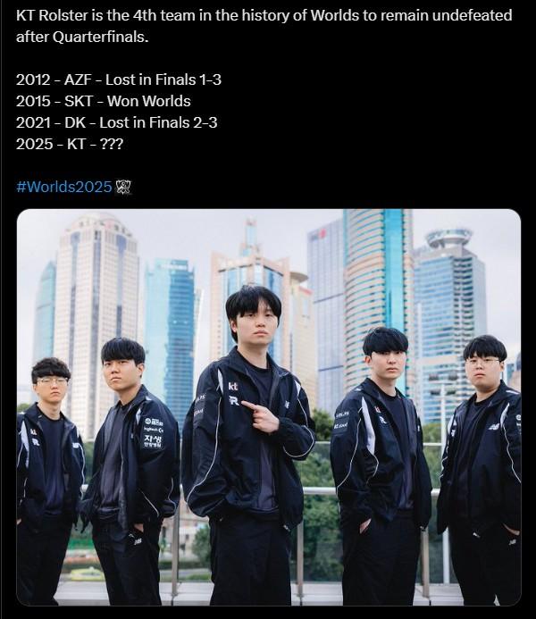 Điều đặc biệt là trong ba đội tiền nhiệm, chỉ có SKT T1 năm 2015 là lên ngôi vô địch, còn AZF và DK đều dừng lại ở trận Chung kết với tỷ số sát nút. Giờ đây, KT Rolster – với phong độ hủy diệt từ Vòng Swiss đến Tứ kết – đang đứng trước cơ hội viết tiếp lịch sử cho riêng mình và có thể trở thành đội thứ hai làm được điều tương tự như SKT T1 huyền thoại.