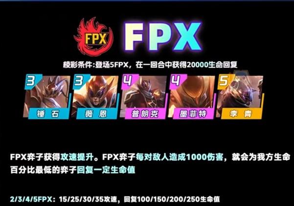 Hiệu ứng hệ FPX: Tướng FPX nhận tốc độ đánh tăng thêm. Mỗi khi tướng FPX gây 1000 sát thương lên kẻ địch, tướng FPX có tỷ lệ phần trăm máu thấp nhất trong đội sẽ hồi một lượng máu nhất định.