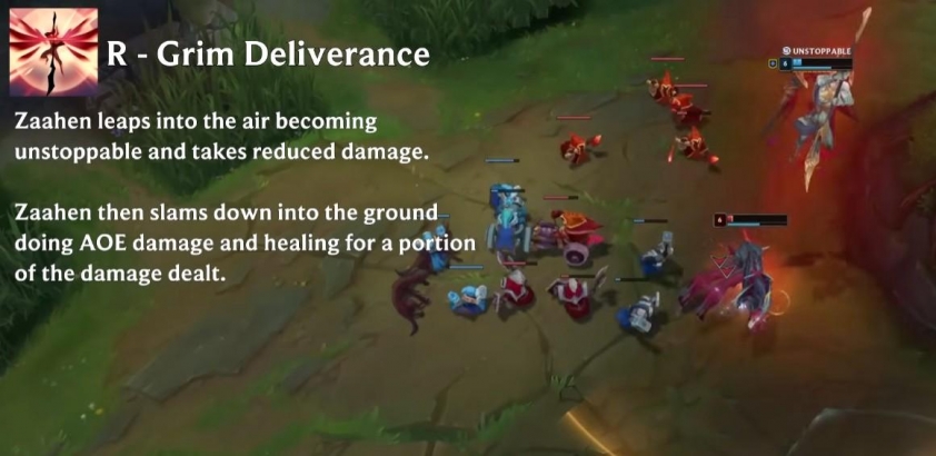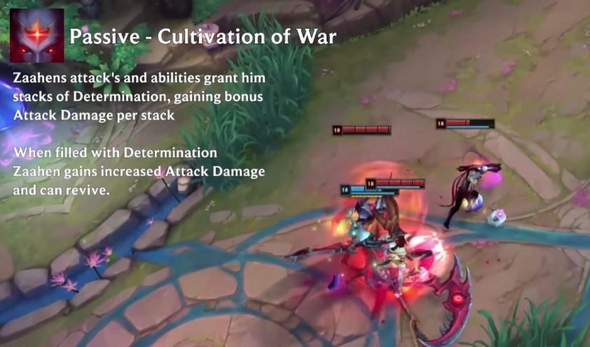 - Khi đạt đủ mức cộng dồn, Zaahen sẽ nhận thêm buff sát thương và có khả năng hồi sinh sau khi bị hạ gục.