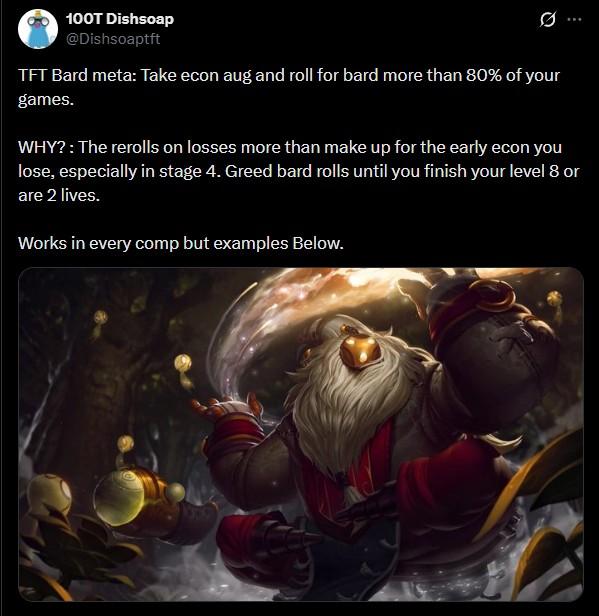 Nghe có vẻ liều lĩnh, nhưng trên thực tế, lượng roll mà Bard mang lại giúp người chơi đạt level 8 nhanh hơn, hoàn thiện đội hình sớm hơn so với phần còn lại của lobby. Đáng nói hơn, Bard không bị bó buộc vào một đội hình cố định, mà có thể lồng ghép vào hầu hết các comp phổ biến ở mùa 16, ngoại trừ một vài trường hợp đặc thù.