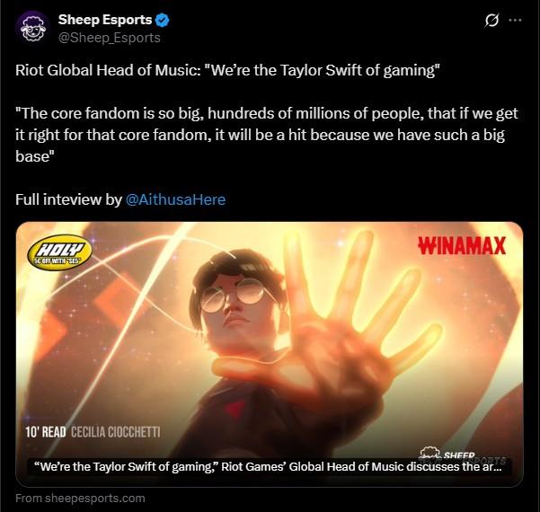 Giữa làn sóng chỉ trích dữ dội về MV chủ đề CKTG 2025, Riot Games lại khiến cộng đồng “bùng nổ” lần nữa khi tuyên bố: “Chúng tôi là Taylor Swift của ngành game.” Phát biểu này đến từ Trưởng nhóm phụ trách âm nhạc của Riot Games trong một buổi phỏng vấn với Sheep Esports. Người này nhấn mạnh rằng “lượng fan trung thành của chúng tôi quá lớn – hàng trăm triệu người – và chỉ cần làm đúng cho nhóm đó, bài hát sẽ trở thành hit”.