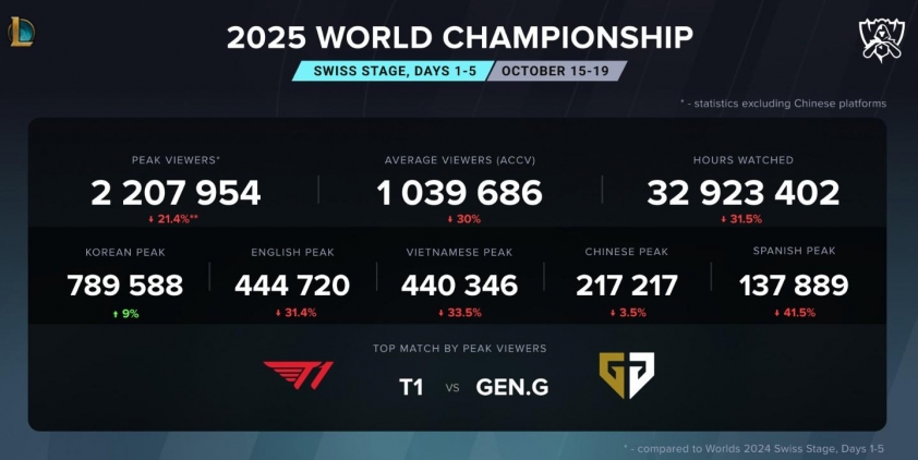 Theo thống kê từ Esports Charts (ngày 19/10), giai đoạn 5 ngày đầu tiên của Vòng Thụy Sĩ CKTG 2025 ghi nhận 2,2 triệu người xem cùng lúc ở mức đỉnh — giảm 21,4% so với cùng kỳ năm ngoái. Lượng người xem trung bình chỉ đạt hơn 1 triệu, thấp hơn 30% so với mùa 2024, trong khi tổng thời lượng theo dõi giảm đến 31,5%.