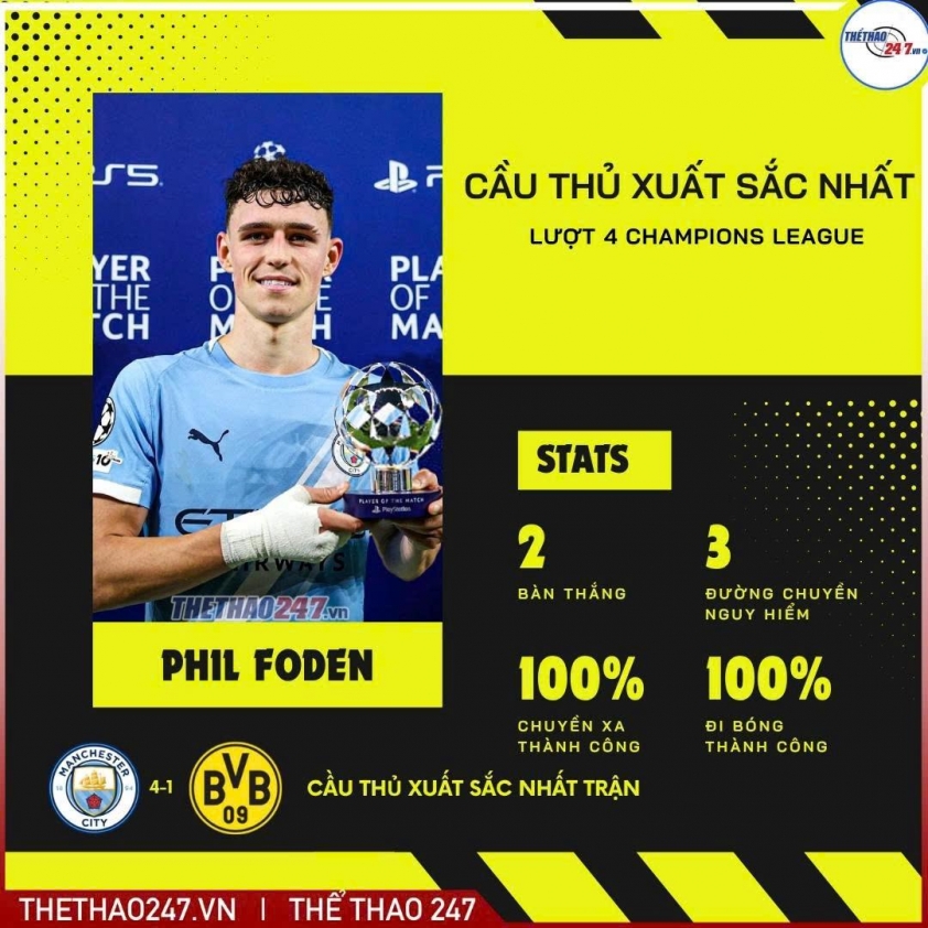 Trong chiến thắng 4–1 trước Borussia Dortmund, Foden đã thi đấu chói sáng với cú đúp bàn thắng cùng một pha kiến tạo giúp Manchester City củng cố vị trí trong nhóm tám đội dẫn đầu giai đoạn vòng bảng.
