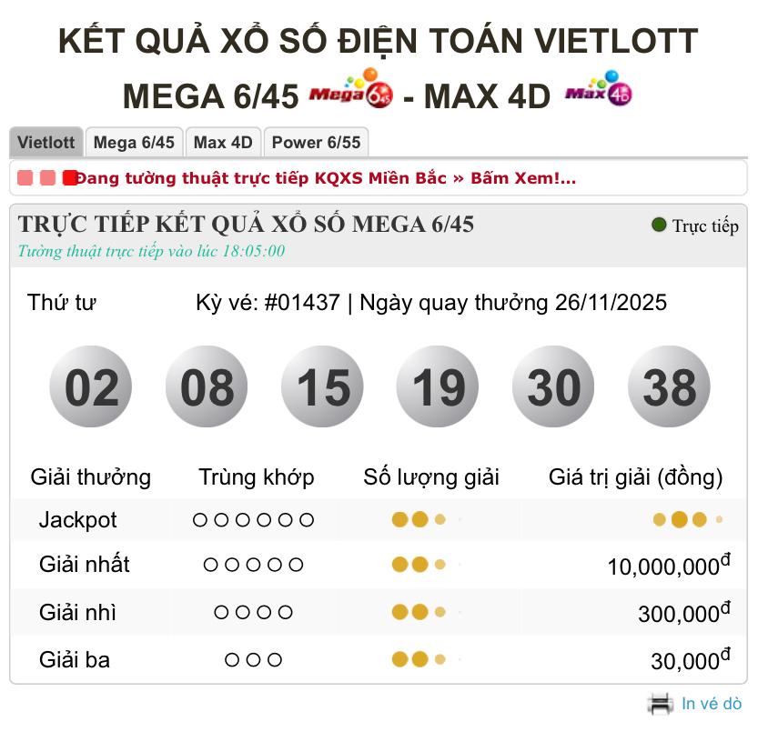 KẾT QUẢ XỔ SỐ VIETLOTT 26/11/2025 - THỨ 4