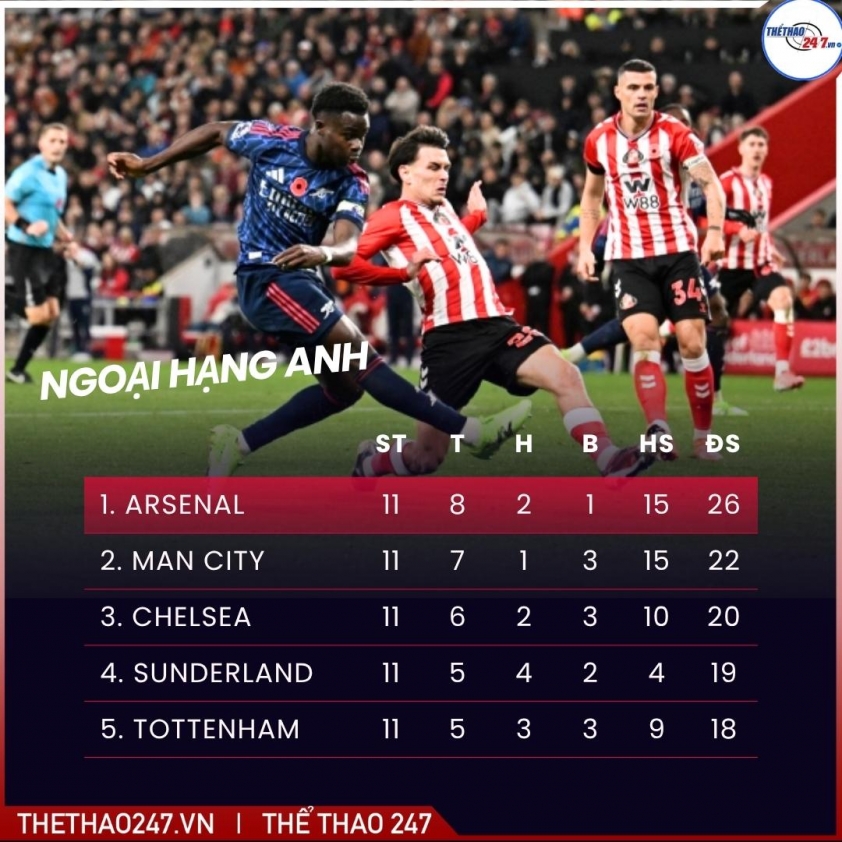 Pháo thủ vẫn duy trì ngôi đầu bảng với 26 điểm. Tuy nhiên, trận hòa này cũng là lời cảnh báo cho thầy trò Mikel Arteta, rằng những đối thủ như Sunderland hoàn toàn có thể khiến họ trả giá nếu chủ quan.
