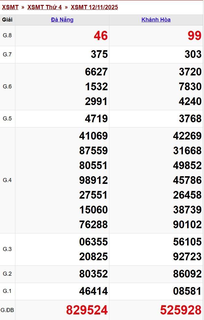 Kết quả xổ số miền Trung (XSMT) hôm qua ngày 12/11