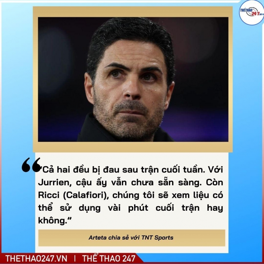 Giải thích về lý do vắng Timber và Calafiori, Arteta chia sẻ với TNT Sports: “Cả hai đều bị đau sau trận cuối tuần. Với Jurrien, cậu ấy vẫn chưa sẵn sàng. Còn Ricci (Calafiori), chúng tôi sẽ xem liệu có thể sử dụng vài phút cuối trận hay không.”