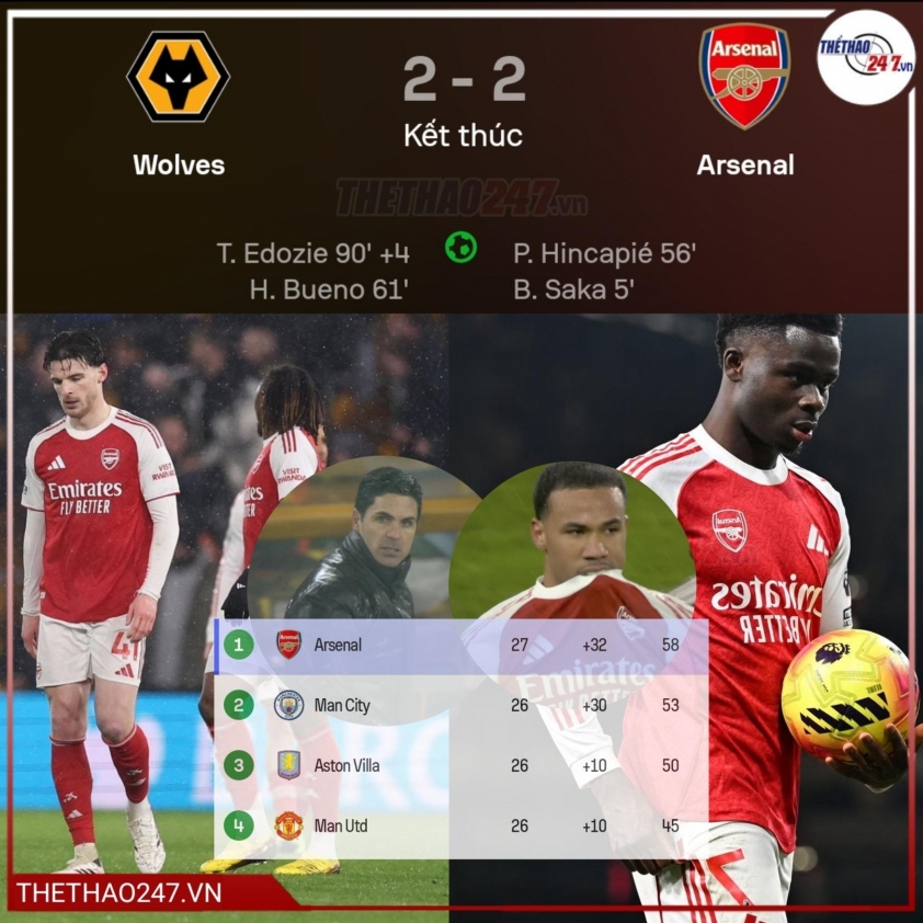 Trên sân, Arsenal khởi đầu đầy hứng khởi, kiểm soát thế trận và tạo ra nhiều cơ hội rõ rệt. Tuy nhiên, sự sa sút về nhịp độ lẫn cường độ pressing trong hiệp hai khiến họ đánh mất quyền kiểm soát. Wolverhampton Wanderers tận dụng tốt những khoảng trống nơi hàng thủ đội khách để trừng phạt sai lầm, qua đó giữ lại một điểm quan trọng.