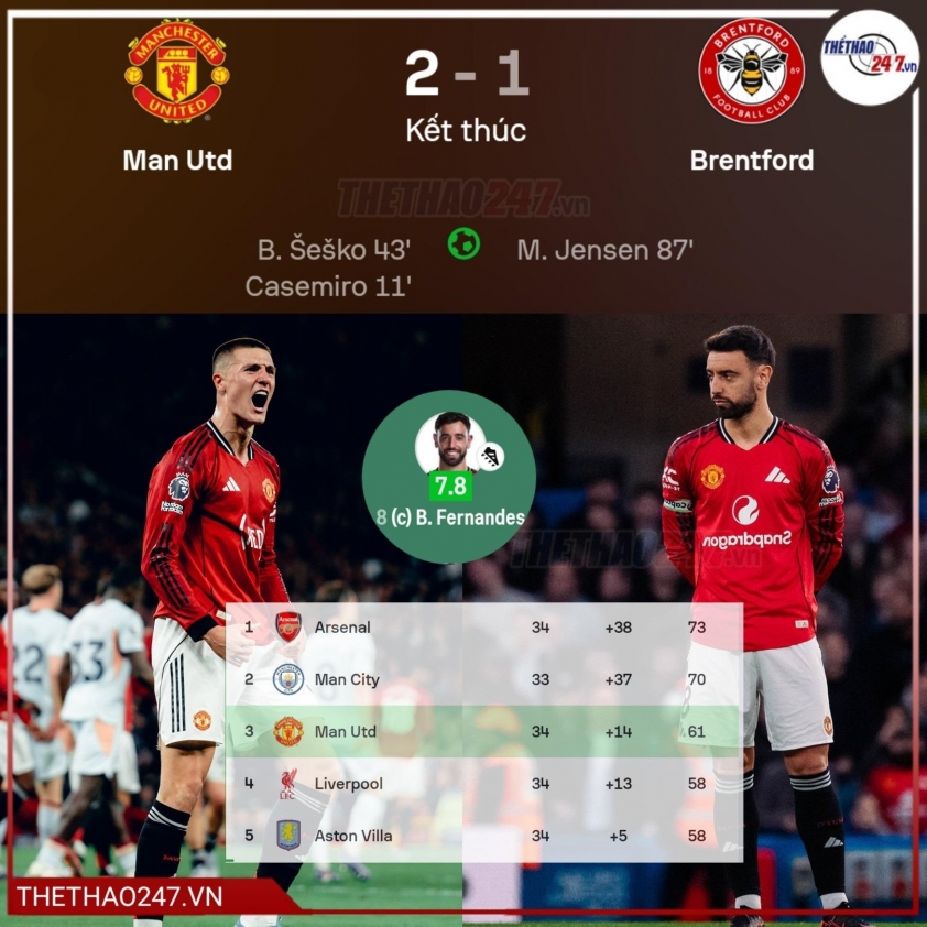 Dù bị Mathias Jensen rút ngắn tỷ số ở cuối trận, Man United vẫn đứng vững để giành trọn 3 điểm, qua đó củng cố vững chắc vị trí thứ ba trên bảng xếp hạng Premier League.