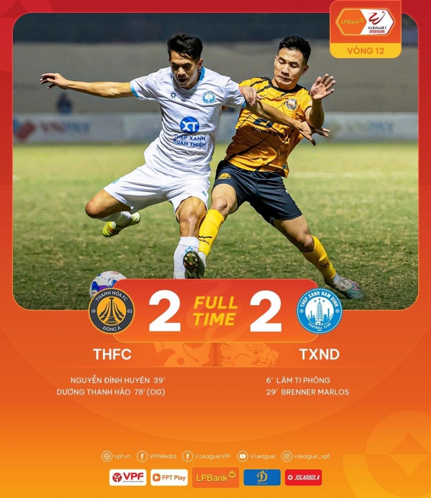 Nam Định đã đánh rơi chiến thắng đầy tiếc nuối khi bị Thanh Hóa cầm hòa 2-2 ở vòng 12 V-League, trong trận đấu mà đội khách nắm nhiều lợi thế nhưng không thể kết liễu đối thủ. Kết quả này khiến cơ hội bảo vệ ngôi vương của Nam Định trở nên xa vời hơn bao giờ hết.