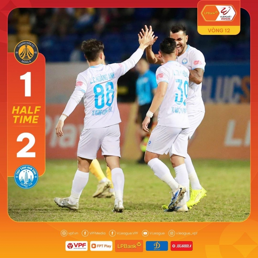 Phút 28, Nam Định tiếp tục gia tăng cách biệt bằng một khoảnh khắc bùng nổ. Ngọc Sơn thoát xuống tốc độ bên cánh phải rồi tạt bóng chuẩn xác, tạo điều kiện để Brenner tung người vô lê đẹp mắt, ghi siêu phẩm nâng tỷ số lên 2-0. Tuy nhiên, trước khi hiệp 1 khép lại, Thanh Hóa kịp rút ngắn cách biệt. Phút 38, từ quả phạt góc bên cánh phải, trung vệ Đình Huyên bật cao đánh đầu hiểm hóc, ghi bàn gỡ 1-2.