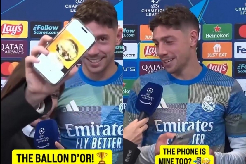 Màn trình diễn đẳng cấp của ngôi sao Real Madrid đã khiến phóng viên Alessia Tarquinio của Prime Video Italia không giấu nổi sự phấn khích. Trong khu vực phỏng vấn sau trận, cô hài hước cầm điện thoại hiển thị hình ảnh Quả bóng Vàng và “trao thưởng” tượng trưng cho Valverde.