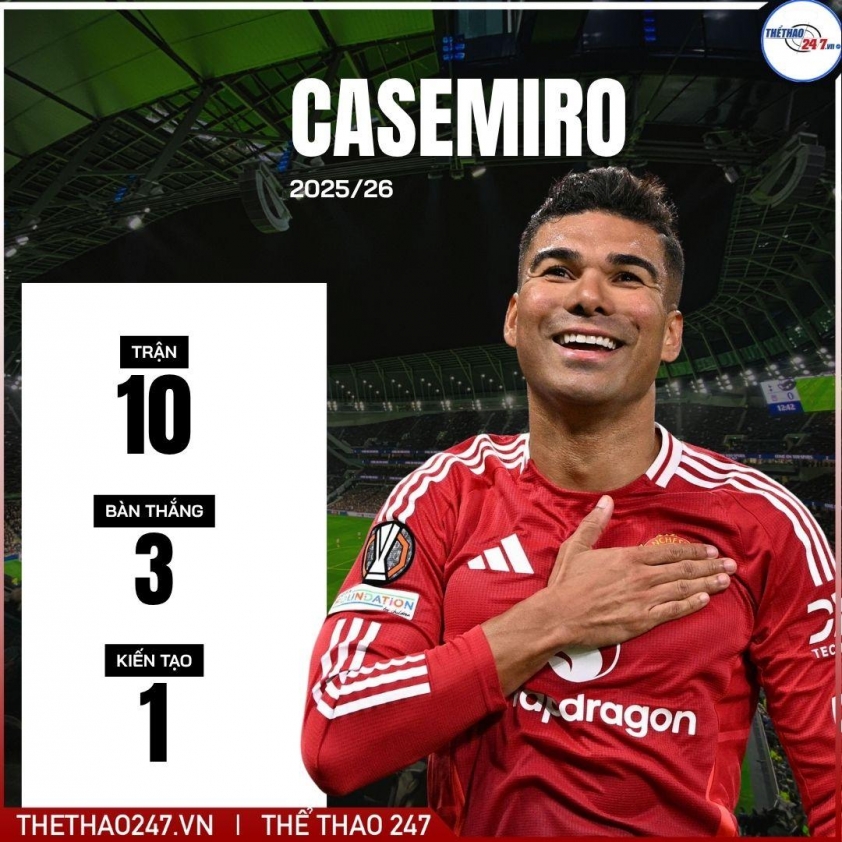 Tiền vệ người Brazil đã ra sân 10 trên mọi đấu trường, trở thành đối tác tin cậy của Bruno Fernandes ở trung tâm hàng tiền vệ. Thống kê cho thấy chỉ có 5 trong số 20 bàn thua của MU mùa này xảy ra khi Casemiro có mặt trên sân, chứng tỏ ảnh hưởng lớn của anh với hàng thủ đội nhà.