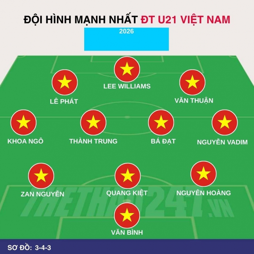 Trên hàng công, bộ ba Lê Phát (Ninh Bình), Lee Williams (CA TP.HCM) và Văn Thuận (Ninh Bình) hứa hẹn tạo nên sức ép lớn lên đối phương. Lee Williams có thể đá trung phong, sở hữu thể hình tốt và khả năng dứt điểm đa dạng. Lê Phát hoạt động rộng, tận dụng tốc độ để khai thác khoảng trống. Văn Thuận lại sắc bén trong các pha xâm nhập vòng cấm.Với cách bố trí này, U21 Việt Nam không chỉ gia tăng áp lực trực diện mà còn triển khai tấn công biên linh hoạt và hiệu quả.