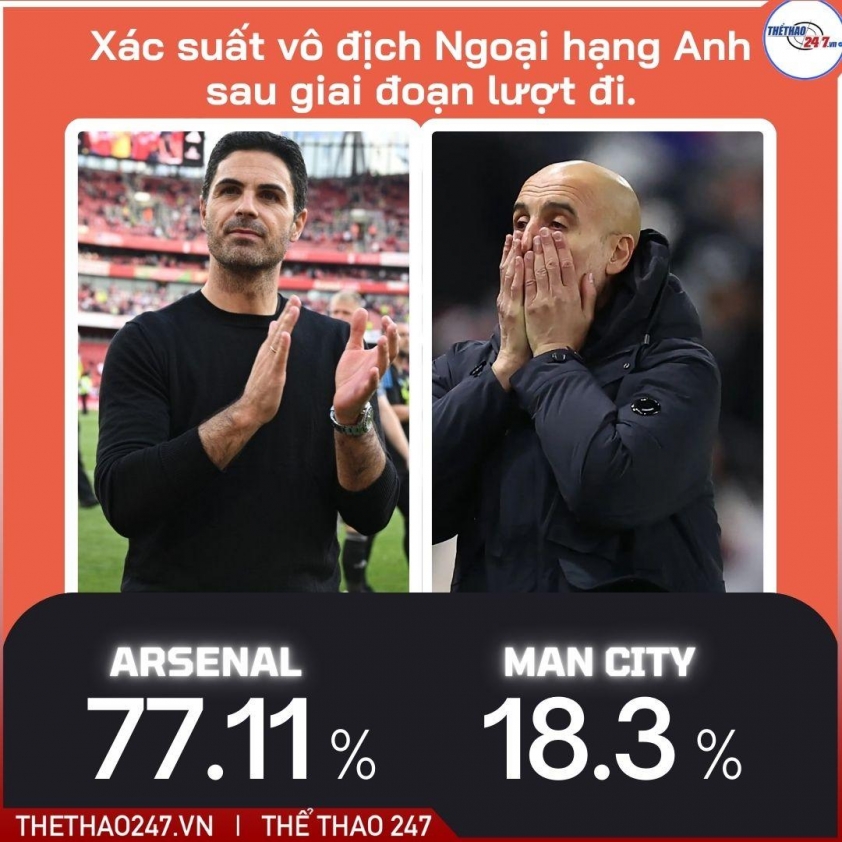 Theo mô hình dự đoán mới nhất của Opta, Arsenal đang mở rộng khoảng cách trong cuộc đua vô địch Premier League mùa giải 2025–2026. Đội bóng của HLV Mikel Arteta được đánh giá có tới 77,11% khả năng đăng quang, vượt trội so với nhà đương kim vô địch Manchester City (18,3%). Sự tiến bộ rõ rệt trong khâu phòng ngự, khả năng pressing toàn tuyến và lối chơi kiểm soát linh hoạt đã giúp “Pháo thủ” vững vàng trên hành trình chinh phục ngôi vương mà họ đã chờ đợi hơn 20 năm.