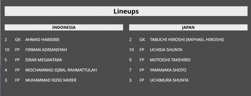- Indonesia: Habibie, Xavier, Iqbal, Megantara, Ardiansyah