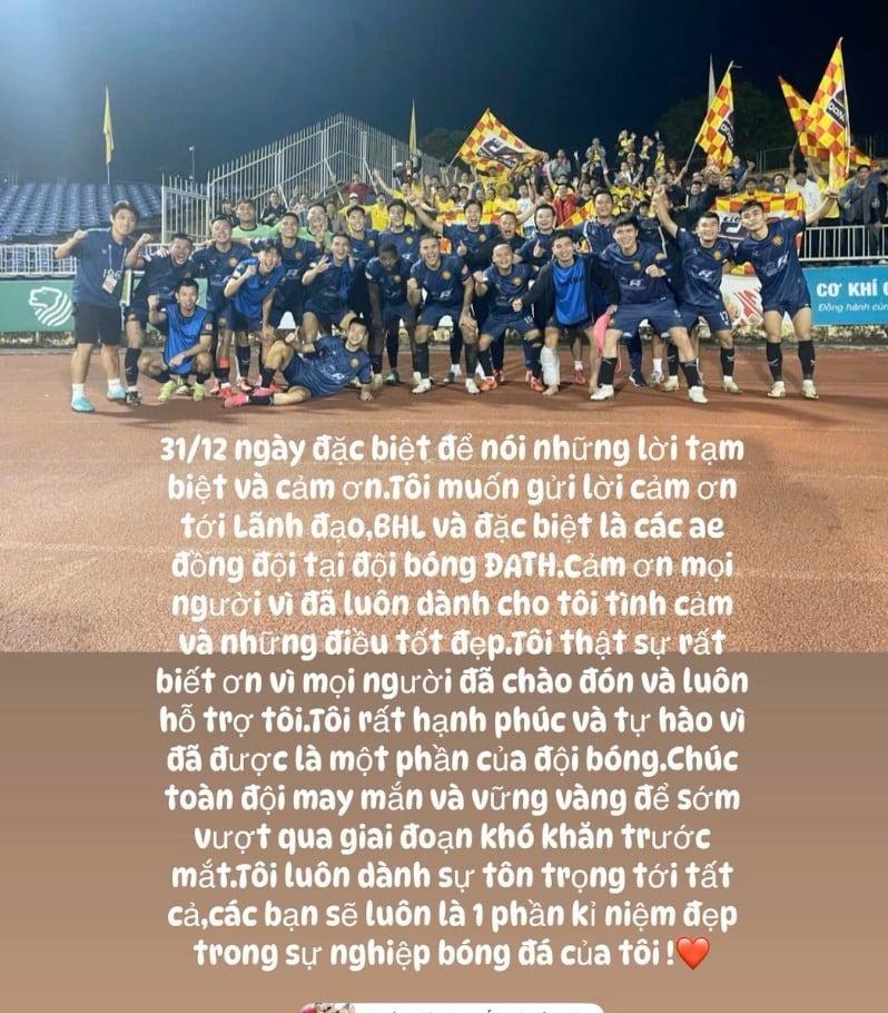 Ngày 31/12, trung vệ người Nghệ An đăng tải trên trang cá nhân dòng chia sẻ xúc động, chính thức xác nhận việc rời đội: “31/12 ngày đặc biệt để nói những lời tạm biệt và cảm ơn. Tôi muốn gửi lời tri ân tới lãnh đạo, ban huấn luyện và các đồng đội tại Đông Á Thanh Hóa. Cảm ơn mọi người vì đã luôn yêu thương và giúp đỡ tôi. Tôi tự hào vì đã từng là một phần của đội bóng này.”