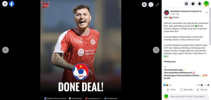 Truyền thông và cộng đồng mạng Indonesia đang đặc biệt quan tâm đến thông tin bóng đá Việt Nam tiếp tục bổ sung lực lượng bằng một cầu thủ nhập tịch chất lượng. Cụ thể, trang Sepakbola Indonesia Fansbook III đã đăng tải bài viết xác nhận việc tiền vệ tấn công gốc Brazil Geovane Magno chính thức trở thành công dân Việt Nam.