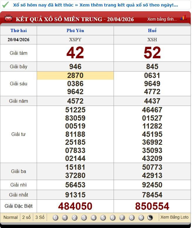 Kết quả xổ số miền Trung (XSMT) hôm nay ngày 20/4