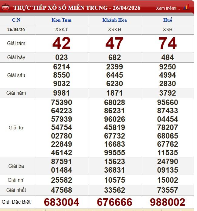 XSMT 26/4/2026 - Kết quả xổ số Kom Tum - Khánh Hòa - Huế hôm nay 26/4/2026