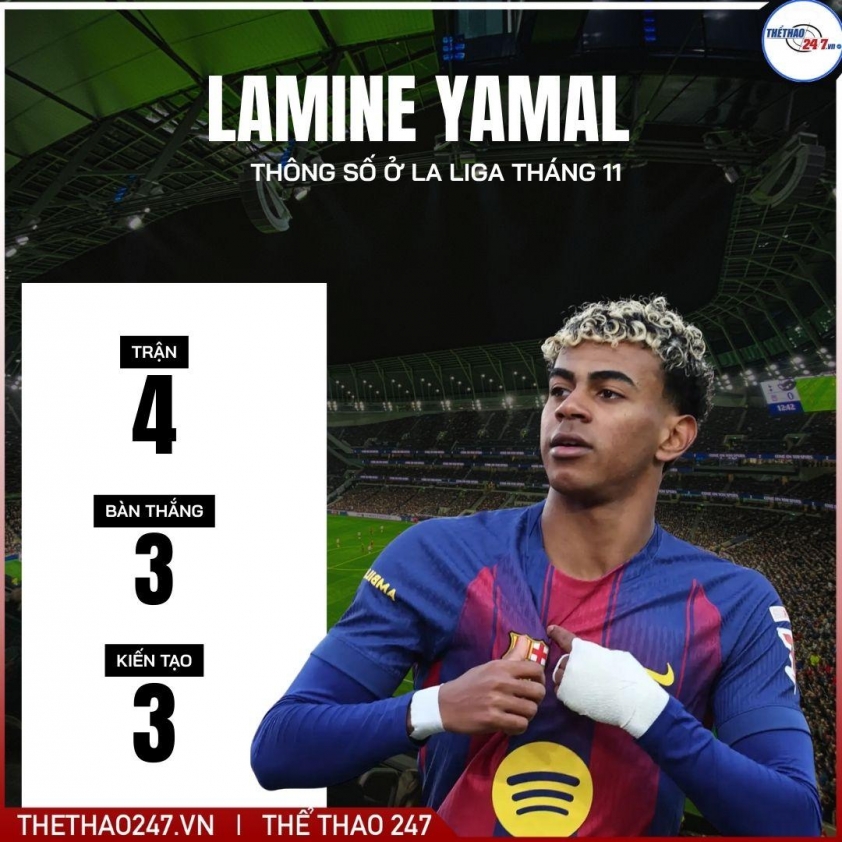 Trong bốn trận đấu tại La Liga tháng 11, Yamal ghi 3 bàn thắng và thực hiện 3 pha kiến tạo, góp công lớn vào các chiến thắng trước Elche, Celta Vigo, Athletic Bilbao và Deportivo Alaves. Ở mỗi trận, anh đều để lại dấu ấn đậm nét: từ cú đúp kiến tạo trong ngày Barcelona trở lại Camp Nou, cho đến màn tỏa sáng với 1 bàn và 1 kiến tạo trong trận thắng Alaves.