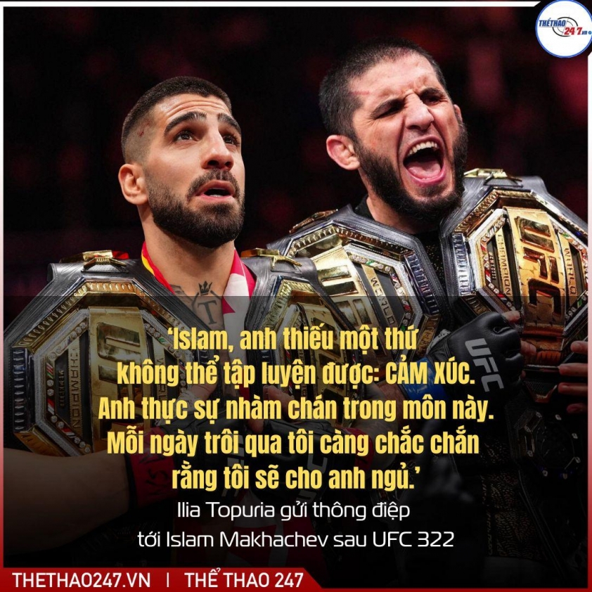 Ilia Topuria đã tweet ngay những dòng dưới đây sau khi Islam Makhachev áp đảo Jack Della Maddalena sau tranh tranh đai vô địch hạng bán trung. Có vẻ như các nhà Double champ đang muốn phân tài cao thấp trong tương lai không xa.