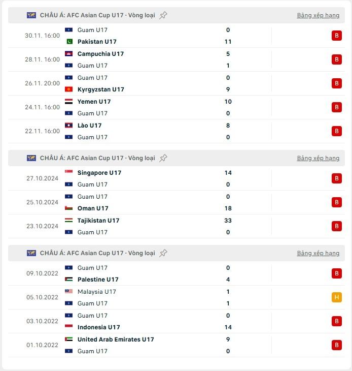 Nhìn lại các bảng đấu, thống kê cho thấy U17 Guam thường xuyên hứng chịu những trận thua nặng. Từ thất bại 0-33 trước Tajikistan, 0-18 trước Oman đến các trận 0-14, 0-11 hay 0-10 trước những đối thủ vừa tầm hơn, bức tranh toàn cảnh cho thấy họ gần như không thể cạnh tranh. Phần lớn thời gian thi đấu, đội chỉ cố gắng duy trì khối đội hình và hạn chế tối đa bàn thua.