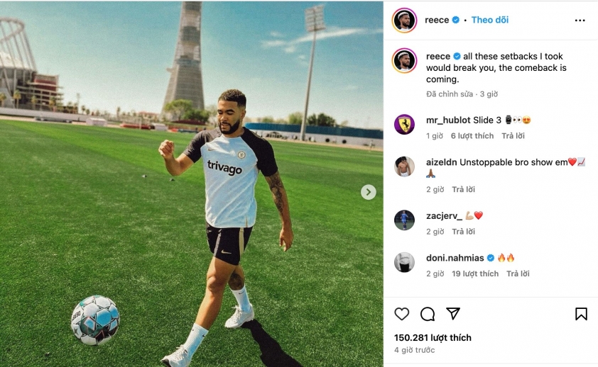 Chia sẻ trên trang cá nhân của mình, cầu thủ chạy cánh Reece James của Chelsea cho biết anh đang trên đường trở lại thi đấu sau một thời gian dài chấn thương. Dòng trạng thái của Reece James cập nhật rằng: "Tất cả những thất bại tôi gặp phải khiến bạn thất vọng, sự trở lại sắp đến" , kèm theo đó là những hình ảnh anh đang tập cùng trái bóng trên sân, trong phòng điều trị và bức hình chụp chung với hai đồng đội Enzo Fernández - Marc Cucurella.
