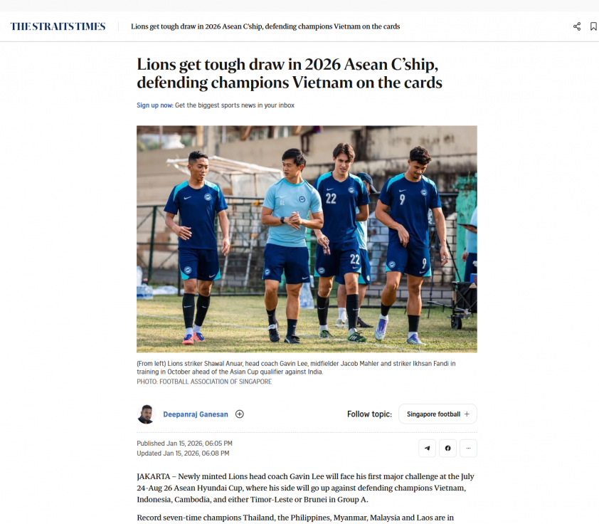 Truyền thông Singapore than trời khi phải nằm chung bảng với Việt Nam, tỏ ra lo lắng về cơ hội đi tiếp của đội tuyển nước nhà.