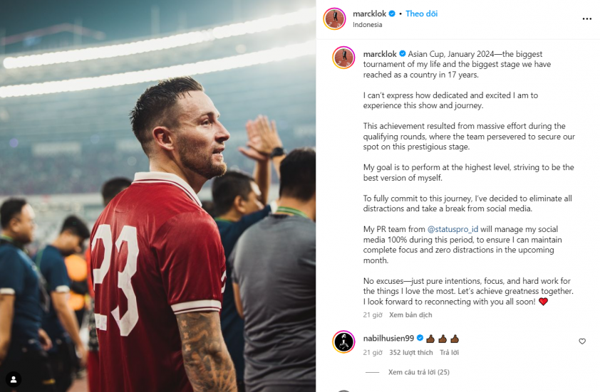 Trên trang cá nhân Instagram mới đây, tiền vệ Marc Klok của ĐT Indonesia đã đăng thông báo tạm dừng mạng xã hội để tập trung cho VCK Asian Cup 2024. Cầu thủ này viết: