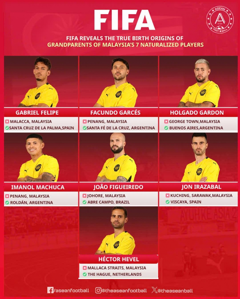 Rạng sáng (7/10), FIFA chính thức công bố quyết định dài 19 trang, khẳng định Liên đoàn Bóng đá Malaysia (FAM) làm giả giấy tờ nhập tịch cho 7 cầu thủ gốc nước ngoài. Điều tra cho thấy ông, bà của các cầu thủ này đều không sinh ra tại Malaysia mà ở các quốc gia như Hà Lan, Argentina, Brazil và Tây Ban Nha, khiến họ không đủ điều kiện nhập tịch hợp pháp theo quy định của FIFA.