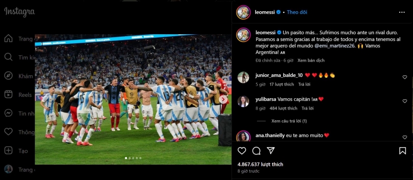 "Thêm một bước nữa... Chúng tôi đã phải chịu đựng rất nhiều trước một đối thủ khó chơi", Messi viết trên Instagram. "Chúng tôi đã vào bán kết nhờ công sức của mọi người, chúng tôi có thủ môn xuất sắc nhất thế giới. Tiến lên Argentina!"