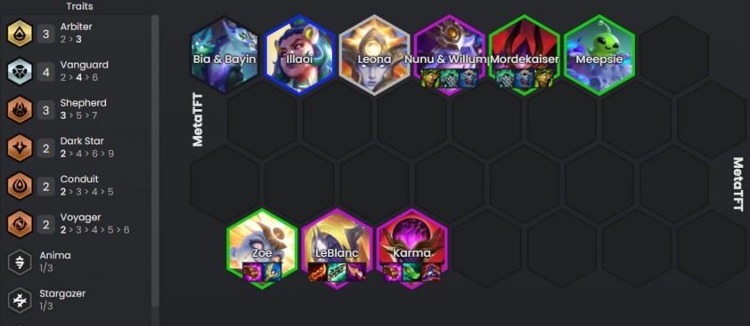 Roll xong chúng ta sẽ up cấp trở lại, cấp 8 có Nunu & Willump Tiên Phong chất lượng cao hơn làm khống chế, kết hợp với LeBlanc Karma để cung cấp nguồn sát thương phụ. Đây sẽ là đội hình cuối cùng trong phần lớn thời gian :