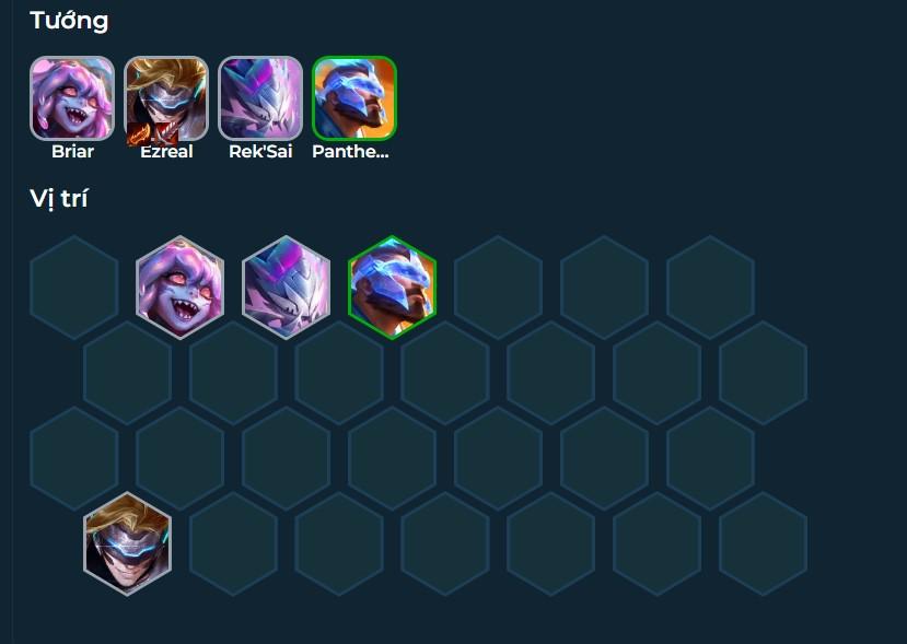 Có hai form có thể áp dụng cho giai đoạn đầu của bàn đấu. Nếu không có Diana sớm, Briar - Rek'sai - Pantheon sẽ là bộ 3 chống chịu hàng trên. Hàng sau cùng sẽ kẹp Ezreal cùng với Cuồng đao và Huyết kiếm( Lưu ý bài này cần cuồng đao và trang bị sát thương sớm).