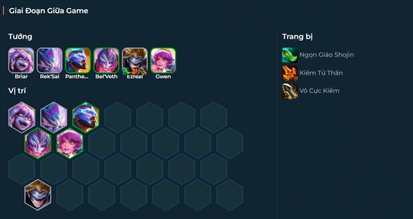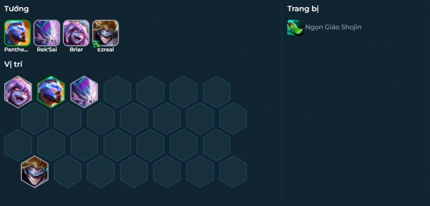 Chúng ta cần một form bài đủ khỏe để có thể tăng cấp từ từ nhưng không bán máu quá nhiều. Ở thời điểm hiện tại, form chuẩn nhất có thể là Pantheon, Rek'Sai, Briar và Ezreal. Với Ezreal ở hàng sau và có sớm Ngọn Giáo Shojin.