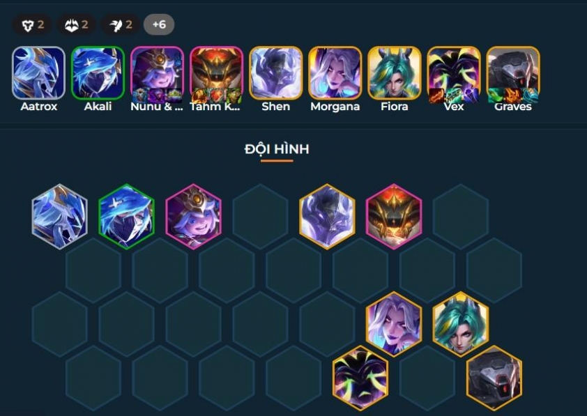 Với form đội hình Graves Exodia, tổng số quân cờ trên bàn sẽ là 9, với một dàn trên đa dụng và hàng dưới cực kỳ nhiều sát thương hỗn hợp. Dàn trên sẽ bao gồm: Aatrox, Akali, Nunu, Shen, Tahm Kench. Cùng với đó là dàn tướng sau nhiều sát thương như Morgana, Fiora, Vex và Graves.