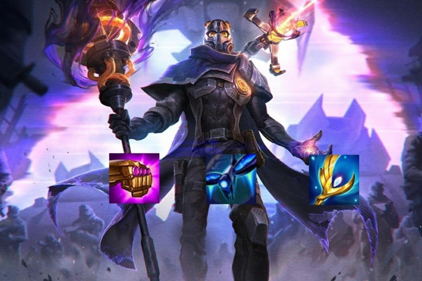 - Trang bị trong bài này ưu tiên dồn cho Viktor trước vì đây là carry chính. Do Tụ Năng đã cho sẵn hồi năng lượng, nên chúng ta sẽ dùng các món tăng sát thương phép như Quyền Trượng Thiên Thần hoặc Găng Bảo Thạch để tối đa hóa sát thương, đồ 3 sẽ là trang bị Siêu Linh Kết Nối Drone.