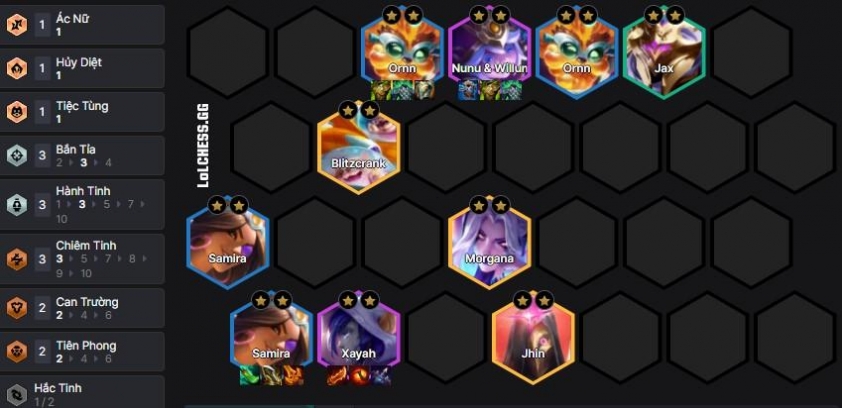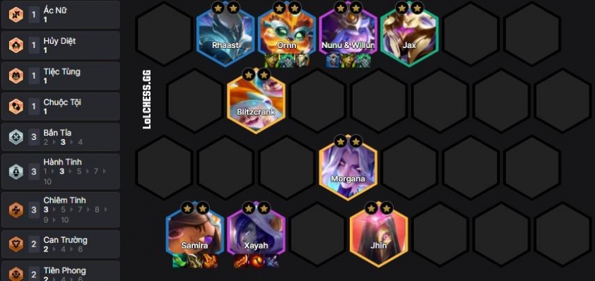 Sau khi 3 sao Samira và Ornn xong, up lên 8 và 9, tìm 5 vàng mạnh như Blitzcrank (thay Nasus), Jhin (Bắn Tỉa) và Morgana (lấy hiệu ứng giảm sát thương là xong bài) :