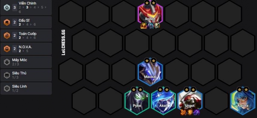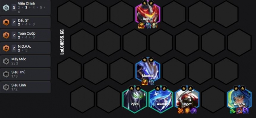 Về trang bị thì Urgot sẽ 1 Áo Choàng Bóng Tối để bảo hiểm và còn lại full sát thương như Diệt Khổng Lồ, Kiếm Tử Thần, Găng Công Lý, Vô Cực không cần lắm vì bản thân Akali đã cho hiệu ứng Chuẩn Xác rồi. Robot có thể cầm 3 món tank bất kỳ, nhưng chuẩn nhất vẫn là 2 Thú Tượng + Móng Vuốt để tận dụng hiệu ứng của 4 Máy Móc, trong khi đó Maokai sẽ cầm các món tank dư ra. Cuối cùng Aurora sẽ cầm các đồ năng lượng và AP dư ra để làm nguồn sát thương phụ.